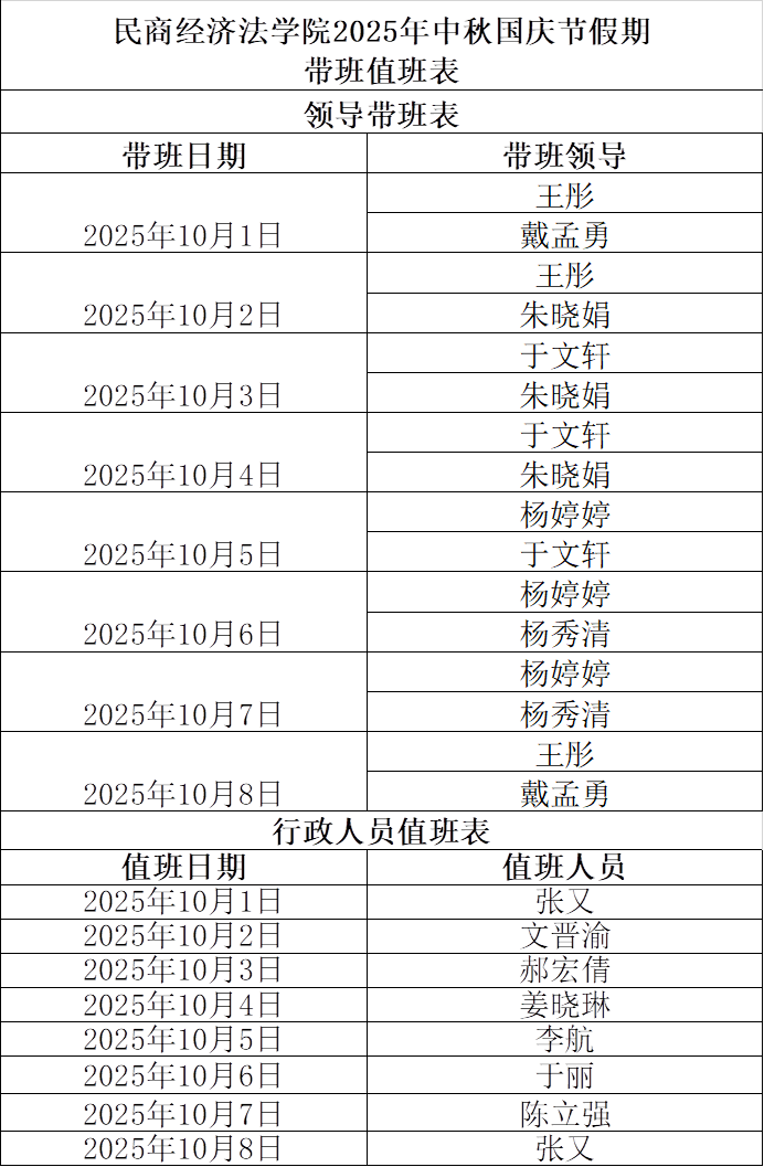 民商经济法学院2025年中秋节国庆节假期带班值班表
