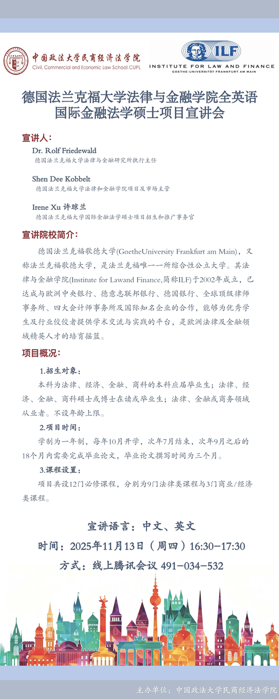 【活动预告】德国法兰克福大学法律与金融学院全英语国际金融法学硕士项目宣讲会