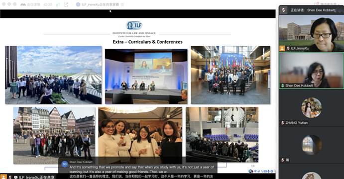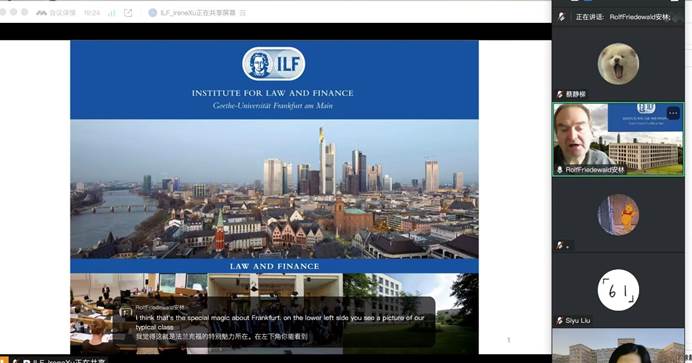 2025年11月13日下午,民商经济法学院举办了德国法兰克福大学法律与金融学院全英语国际金融法学硕士项目宣讲会,邀请德国法兰克福大学法律与金融研究所执行主任安林博士(Dr. Rolf Friedewald),法律与金融学院项目及市场主管Shen Dee Kobbelt老师以及国际金融法学硕士项目招生和推广事务官许琼兰(Irene Xu)老师在线宣讲。本宣讲会由民商经济法学院外事办公室张雨田老师主持,来自民商经济法学院的十余名本科生和硕士生在线参会。